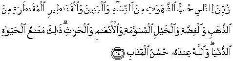 Dihiaskan (dan dijadikan indah) kepada manusia: kesukaan kepada benda-benda yang diingini nafsu, iaitu perempuan-perempuan dan anak-pinak; harta benda yang banyak bertimbun-timbun, dari emas dan perak; kuda peliharaan yang bertanda lagi terlatih; dan binatang-binatang ternak serta kebun-kebun tanaman. Semuanya itu ialah kesenangan hidup di dunia. Dan (ingatlah), pada sisi Allah ada tempat kembali yang sebaik-baiknya (iaitu Syurga). QS 3:14